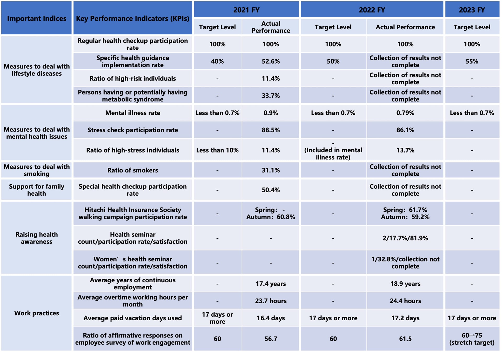 These policies have produced results in terms of "enhancing each employee's subjective view of health," "reducing the rate of employees at work in spite of mental or physical issues (presenteeism)," "reducing the rate of employees on leave due to mental or physical issues (absenteeism)," and "raising the engagement index." Through "health management" initiatives, HIES aims to strengthen a sustainable business foundation supporting growth, increase value for customers, and contribute to the advancement of society globally and to the environment.