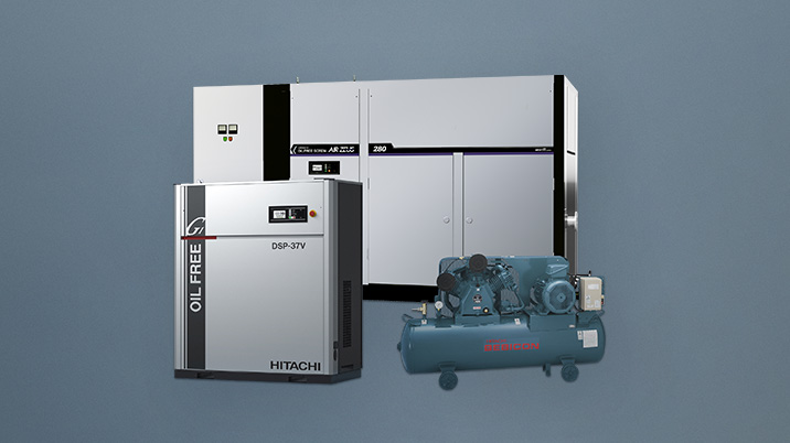 Some standards require that impurities be eliminated from compressed air and recommend the use of oil-free compressors. Hitachi Industrial Equipment Systems meets the needs of its customers with an assortment of oil-free compressors that meet customers' needs in a broad range of applications. Hitachi Industrial Equipment Systems product line includes quiet and compact products, and products that can be used in small factories where storage space is limited and factories that are near residential areas. Casters and tanks may be installed on some of the products. Cleaning the area around the equipment is also easy.