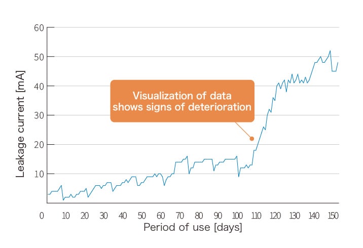 By introducing Hitachi’s insulation monitoring, leakage current can be constantly monitored. Monitoring the leakage current not only detects danger but also helps in the maintenance planning of equipment. In addition, connecting the unit to the system allows the measurement data to be saved, which can be used to readily compare the measured values with the past values and with other equipment.