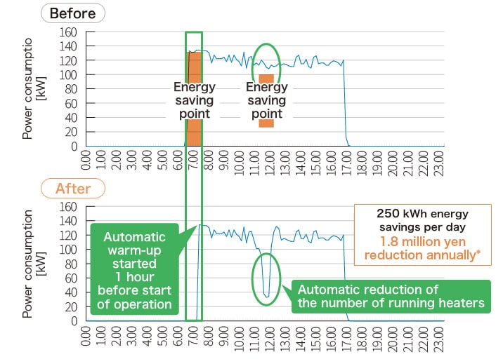 Use of timers to shorten warm-up time and reduce the number of running heaters during lunch breaks