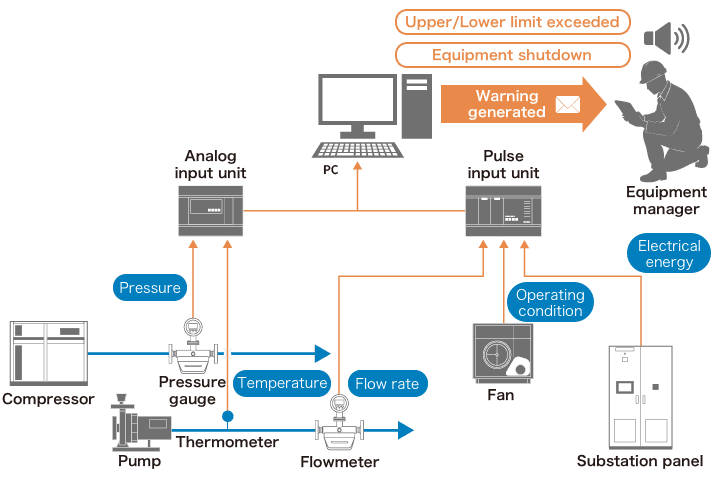 - Acquires and manages various types of data such as flow rate and temperature with current (DC4-20 mA), voltage (DC1-5 V), and resistance input (Pt100)